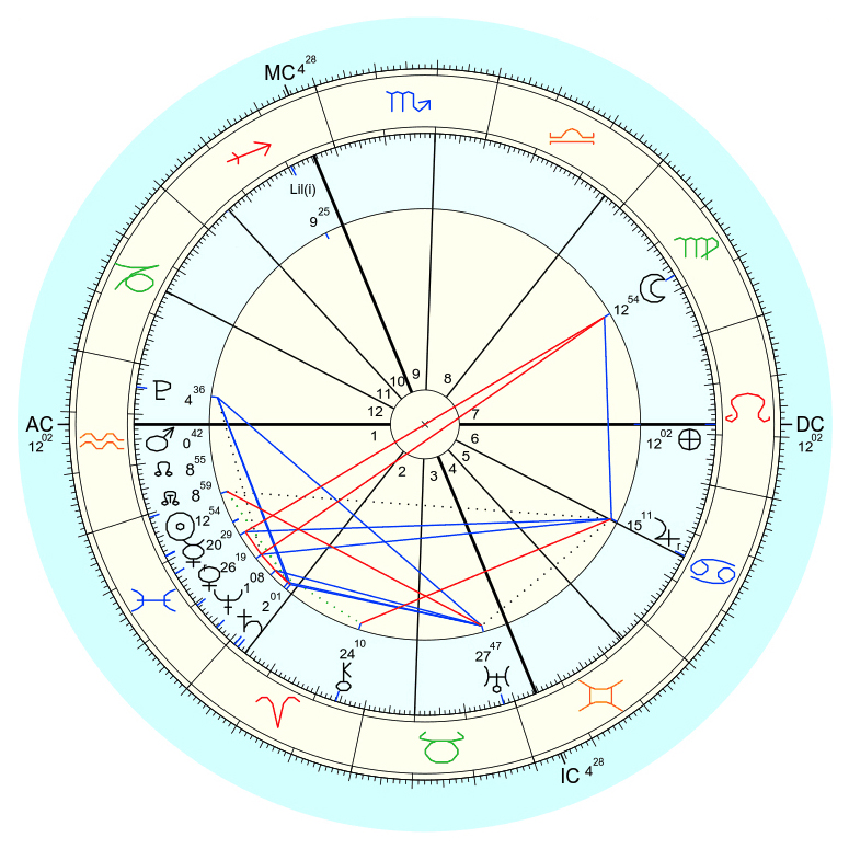 Other than most-elevated and WAY out-of-bounds Black Moon Lilith, the most important feature of this chart s the impressive spread of "planets" ("wanderers') within 30 degrees of each other, in this case in the first and second houses. Astrologer Eric Francis (of Planet Waves, etc.) has addressed this phenomenon extensively, so I won't comment on that part of the astrology here myself.