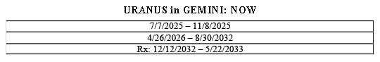 I leave it to others to speculate about the specifics of this go–around of Uranus in Gemini for the place and people that has been the United States. However, any astrologically–based accurate observation is likely related to one or more precedents of when Uranus was in Gemini previously.